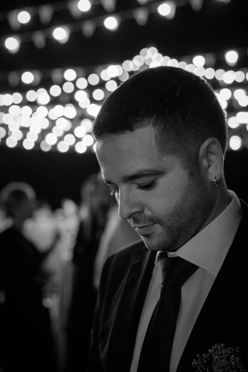Black and white photo of a man in a suit looking down, with blurred string lights in the background. View fullsize