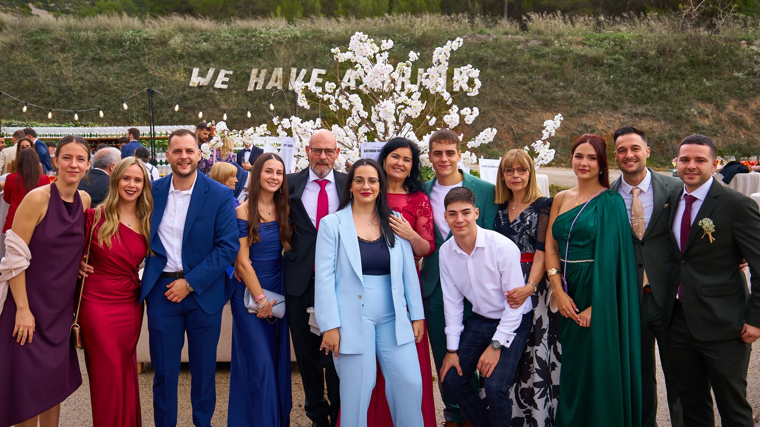Group of people posing for a photo at an outdoor event, dressed formally, with floral decorations and a "WE HAVE..." sign in the background.