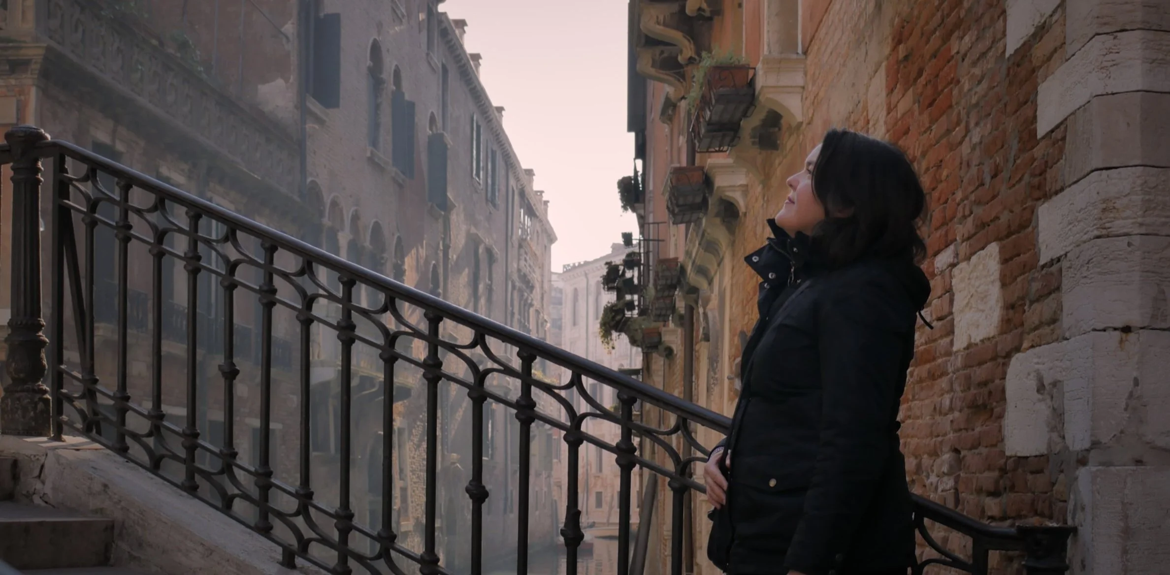 A person standing near a canal in Venice, Italy, wearing a black coat. They are looking up at the architecture of the surrounding historic buildings.