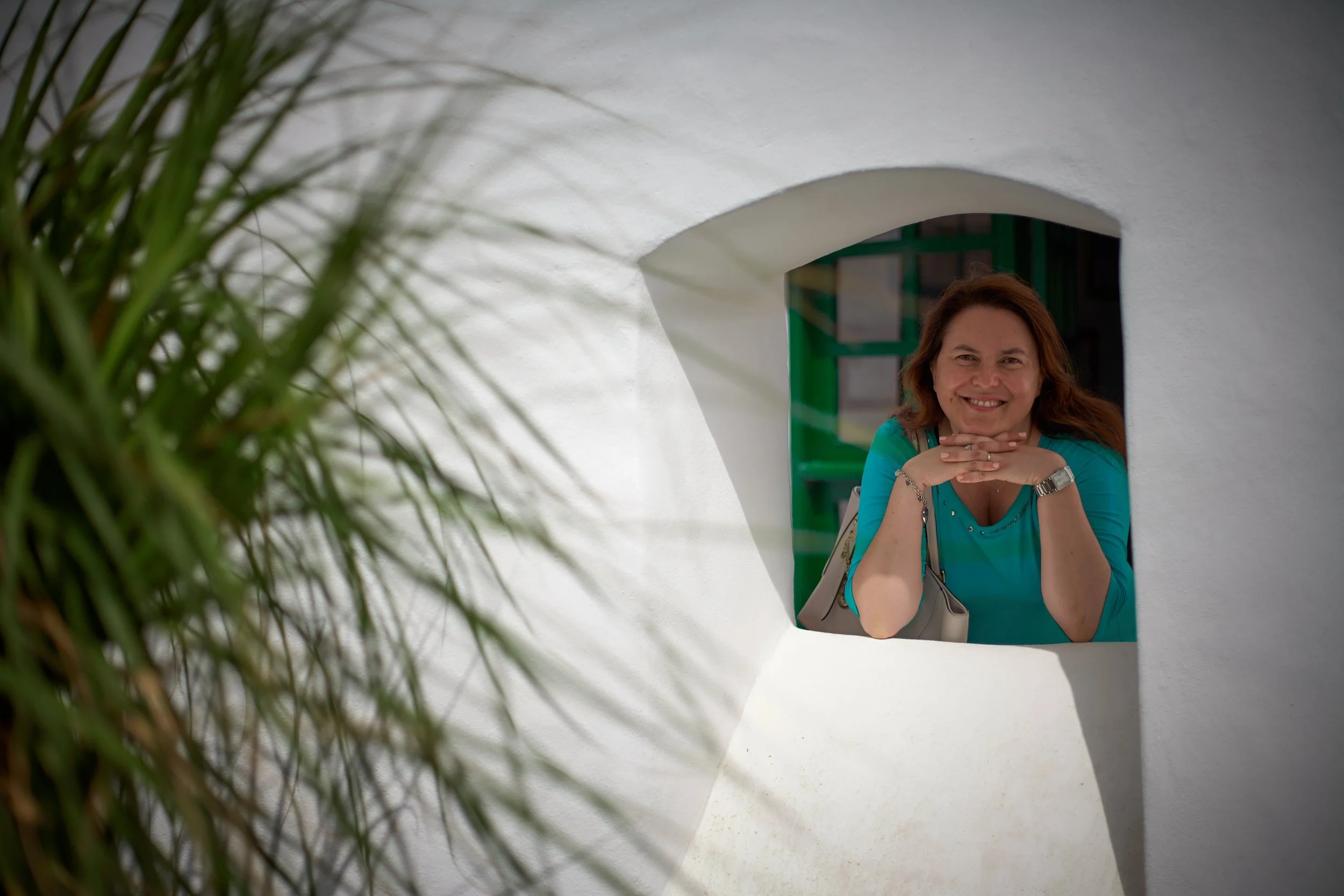 Smiling woman in turquoise shirt leaning on a white windowsill with greenery in foreground.